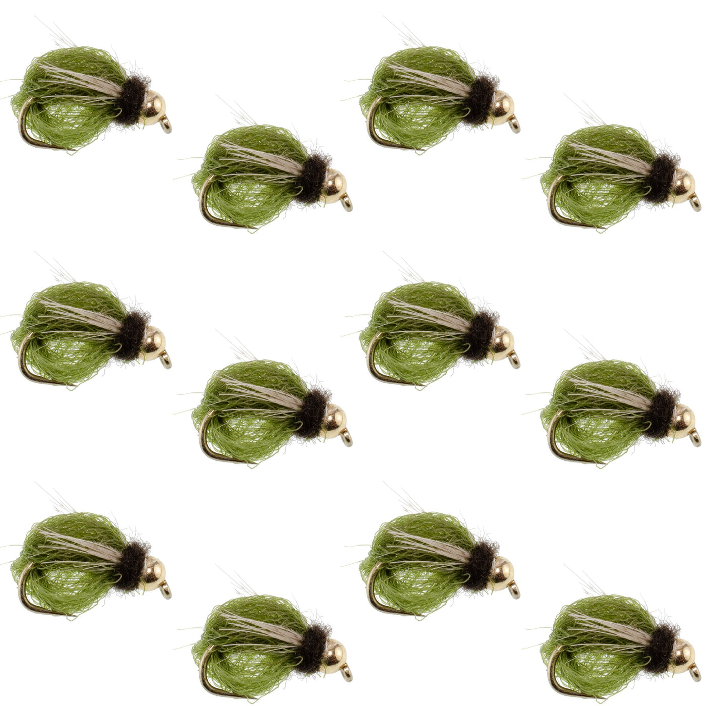 Early-Stage Caddis Pupa Imitation — Represents caddis pupae as they exit their cocoons and drift along the riverbed or mid-water column during spring through fall hatches; the sparkle yarn imitates trapped air bubbles around the pupa
